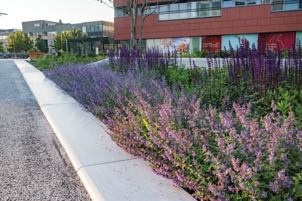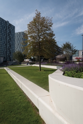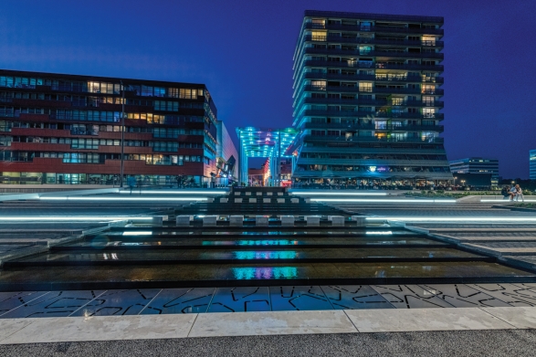 Linde Elsinga van Echo Urban Design maakte een ontwerp met slechts 3 ingrediënten: gras, asfalt voor de paden en witte Solid zitelementen. De witte Solid zitelementen zijn onderdeel van Solids & Seats parkmeubilair en een stijlvolle toevoeging aan de inrichting van pleinen, straten en andere openbare ruimtes. De Solid banden kunnen gecoat worden, waardoor graffiti er makkelijk afgehaald kan worden. Daarnaast is het beton glad afgewerkt, wat ervoor zorgt dat het vuil minder goed blijft plakken. Elsinga: ‘Om het plein op alle dagdelen en alle seizoenen een levendige uitstraling te geven, hebben we gekozen voor bijzondere, geïntegreerde LED-verlichting in de Solid zitelementen. Zodra de schemering invalt, kan je de mooie lijnen van de witte banden volgen en wordt het hoogteverschil tussen centrum en water mooi benadrukt. Almere is een prachtig en functioneel plein rijker!’