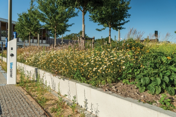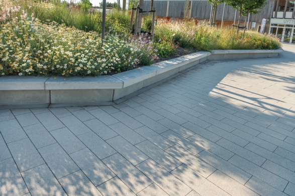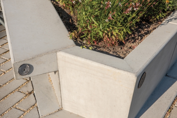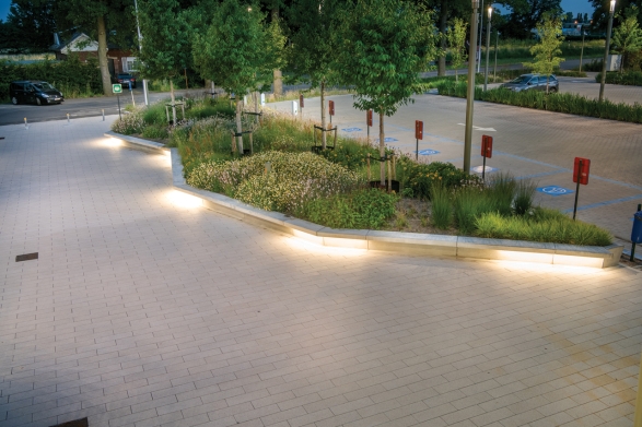 Door de groenvlakken bij de entree te verhogen met Greenline zitranden, wordt de connectie met de passant/gebruiker groter. Ook de bomen staan hoger en zorgen voor meer groene impact. En dat was nodig want wat de reële oppervlakte betreft, overheerst de verharding op het groene. De finishing touch komt in de vorm van LED-verlichting in de Greenlines die de entree in de avond een uitnodigend karakter geven.