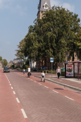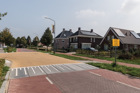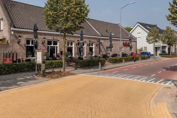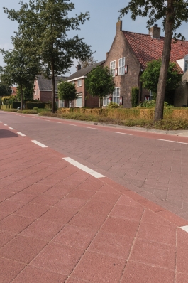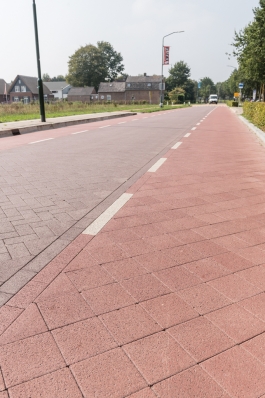 Om de geluidsoverlast te verminderen had de gemeente kunnen kiezen voor asfalt, maar in plaats daarvan hadden stenen de voorkeur. Rombouts: ‘De keuze voor losse elementen is om verschillende redenen gemaakt. Zo zijn stenen beter bestand tegen in- en uitdraaiend verkeer op kruispunten dan asfalt, hebben elementen de voorkeur boven asfalt als er kabels en leidingen in de rijbaan liggen, is men geneigd om harder op asfalt te rijden dan op stenen en passen stenen beter bij het dorpskarakter dan asfalt.’