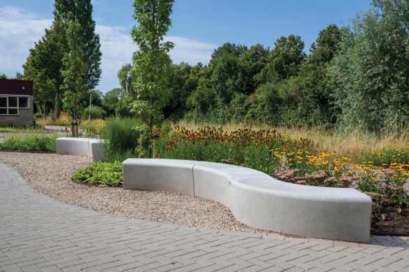 Solids & Seats spelen een belangrijke rol in het ontwerp. De bochten creëren kleine afgeschermde ruimtes, kaderen verschillende functies en beschermen de weelderige beplanting.