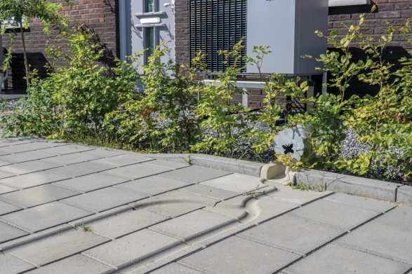Onder normale omstandigheden staat de retentie volledig droog en is dit een aantrekkelijke groene zone die centraal in het plan ligt. Tijdens extreme langdurige regenbuien bergt deze het regenwater afkomstig van de daken en bestrating binnen het plangebied. Dit gebeurt via waterspuwers in combinatie met hemelwaterafvoertegels.