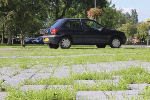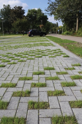 De Greenbrick is een holle keiformaat steen van gerecycled kunststof die met teelaarde of bomenzand en graszaad wordt opgevuld. Voor een stabiel legverband zijn de Greenbricks aan de bovenzijde voorzien van speciale verstevigingsribben. De Greenbrick wordt vooral gebruikt vanwege de mooie, groene uitstraling. Het graspatroon breekt grote oppervlaktes verharding. Bovendien kan deze vorm van open bestrating bij extreme regenval water laten infiltreren in de bodem. ‘De Greenbrick groensteen is daarnaast goed beloopbaar, ook voor de minder mobiele mensen die in de instelling wonen. Dat was natuurlijk een belangrijke randvoorwaarde bij de zoektocht naar een geschikte verharding voor het parkeerterrein’, vertelt landschapsarchitect Pim Kupers. Met een combinatie van open en gesloten bestrating is een solide en groene parkeerplaats gerealiseerd voor de bezoekers van Huize Ursula.