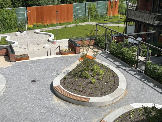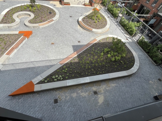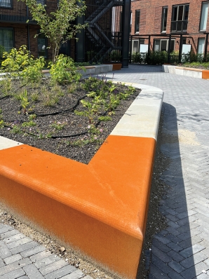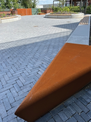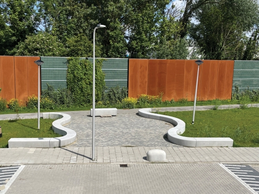 Gewichtsbesparing op het parkeerdak was essentieel en daarom waren zitelementen in een holle uitvoering een uitkomst voor de inrichting. De Solids & Seats zijn gemaakt van vezelversterkt beton, dus zonder stalen wapening. Ze worden geproduceerd met circa 47% minder beton in vergelijking met de reguliere zitelementen. Dit kan na het einde van de levensfase zonder problemen opnieuw worden hergebruikt. Over het hele volume bekeken hebben ze daardoor een lagere milieubelasting.
