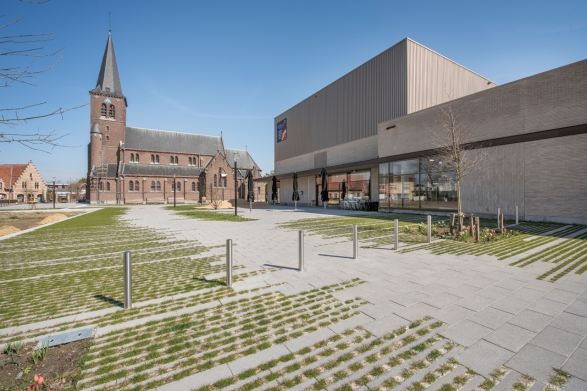 Ontwerpbureau Omgeving werd ingeschakeld voor het maken van een ontwerp. ‘We wilden een groen dorpshart voor Wilsele maken’, vertelt Koen Moelants. ‘Natuurlijke waterinfiltratie, een groen straatbeeld en ontharden waren belangrijke uitgangspunten in ons ontwerp. Ook moest er ruimte komen voor een verhard plein voor voetgangers en fietsers en waar de kraampjes van de markten en de kermis op konden staan. In onze zoektocht naar waterdoorlatende groenbestrating in grootformaat is een nieuw product geboren: Hydro Lineo XL.’