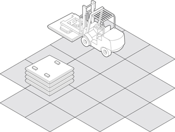 | De vloerplaten stapelen op een vlakke en stabiele ondergrond voorzien van drie steunpunten met behulp van stapelstenen.(betontegels of klinkers van gelijke dikte) Zorg dat de onderste vloerplaat vrij blijft van de ondergrond. De stapelstenen dienen loodrecht onder elkaar te worden gelegd. (zie figuur 1) Vloerplaten dienen één voor één opgestapeld te worden tot een maximale hoogte van 1,5 meter. |