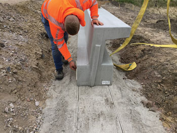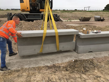 1. Bij slechte ondergrond eerst 2 beddingen neerleggen.2. Hierop 2 balken wegleggen om het 1e element op te plaatsen.