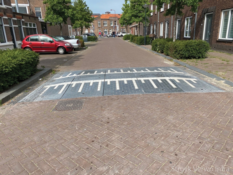 De verkeersdrempel-elementen zowel in langs- als ook in dwarsrichting goed opsluiten.Verwerking in asfaltwegen